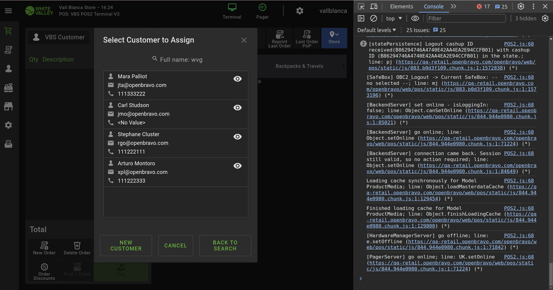| Steps To Reproduce | 1) Log in to POS2 2) Click the 'VBS Customer' field above the order to assign a customer 3) Enter 'wvg' in the Full Name field (or any other value that would show more than one customer) 4) Click 'Search' 5) Open developer tools in the same window as your browser (image [1]) 6) Press the left border of the developer tools and drag to the left until the limit (the POS window will be reduced and eventually it will change to portrait mode) 7) When you reach the limit, you can return to the normal size or close developer tools; check that the popup has returned to Search Customer to Assign | |||||||||||