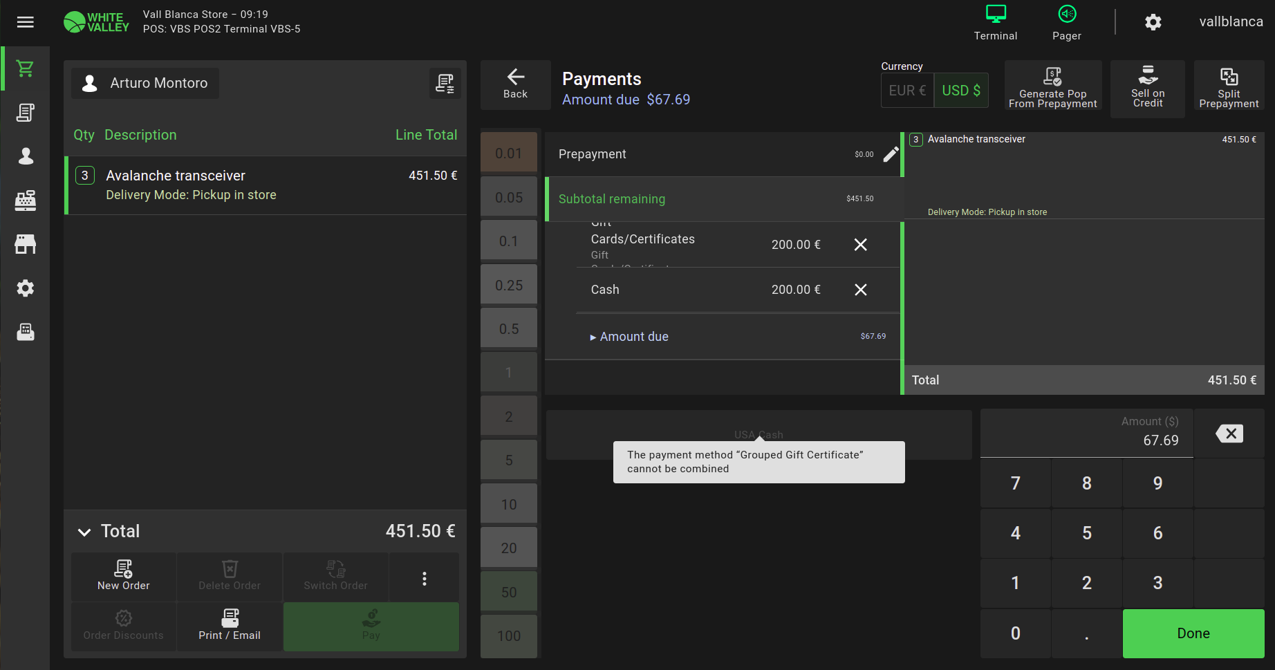Descriptionduring payment, Grouped gift certificate payment method can be combined with every other currency except USA cash, for which a popup shows that says 'the payment method "grouped gift certificate" cannot be combined'