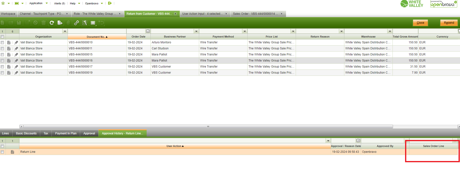 | Steps To Reproduce | In any POS2 enviroment that contains the sampledata (i.e. livebuilds) 1- In the backoffice, update permissions to the VallBlancaUser role, so that it requires approval when executing the "Return Line" action. 2- In the backoffice, update permissions to the The White Valley Group Admin role, so that it can approve the "Return Line" action 3- Log in in the POS with the vallblanca user, make sure the VallBlancaUser role is active 4- Add a line and return it. A popup will be displayed asking for user inputs and approval. Add them (use Openbravo/openbravo in the approval), complete the ticket. 5- Go to the backend, open the Return from Customer window, check the record that was created and check that the Approval History subtab contains info related to the approval that just took place. So far, this is the expected behaviour. Now: 6- In the backoffice, deactivate all user inputs from the Return Line action in the User Action Input window. 7- Back in POS2, refresh the masterdata so that the changes done in the backoffice are applied. Repeat steps 4 and 5, and notice how in the new Return from Customer record there is no trace about the Sales Order Line value. | |||||||