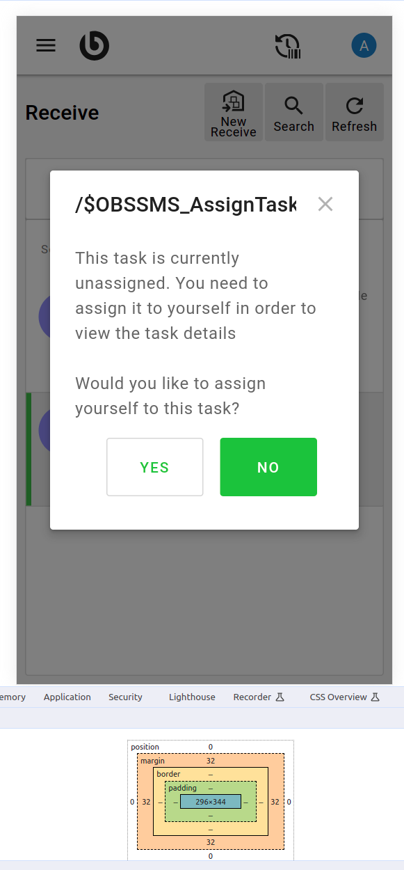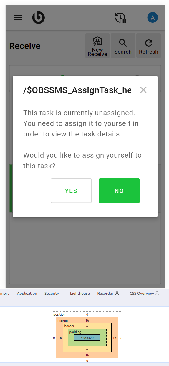 5- Once the task is unassigned (the question mark '?' should be shown in the row), confirm it by swiping left. A dialog will be shown. Check the dialog margins."