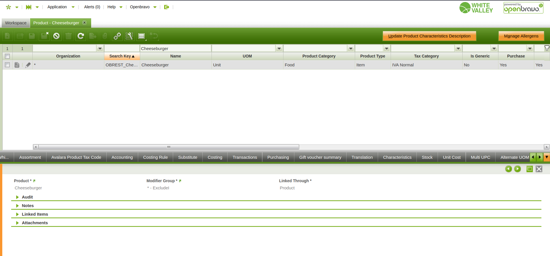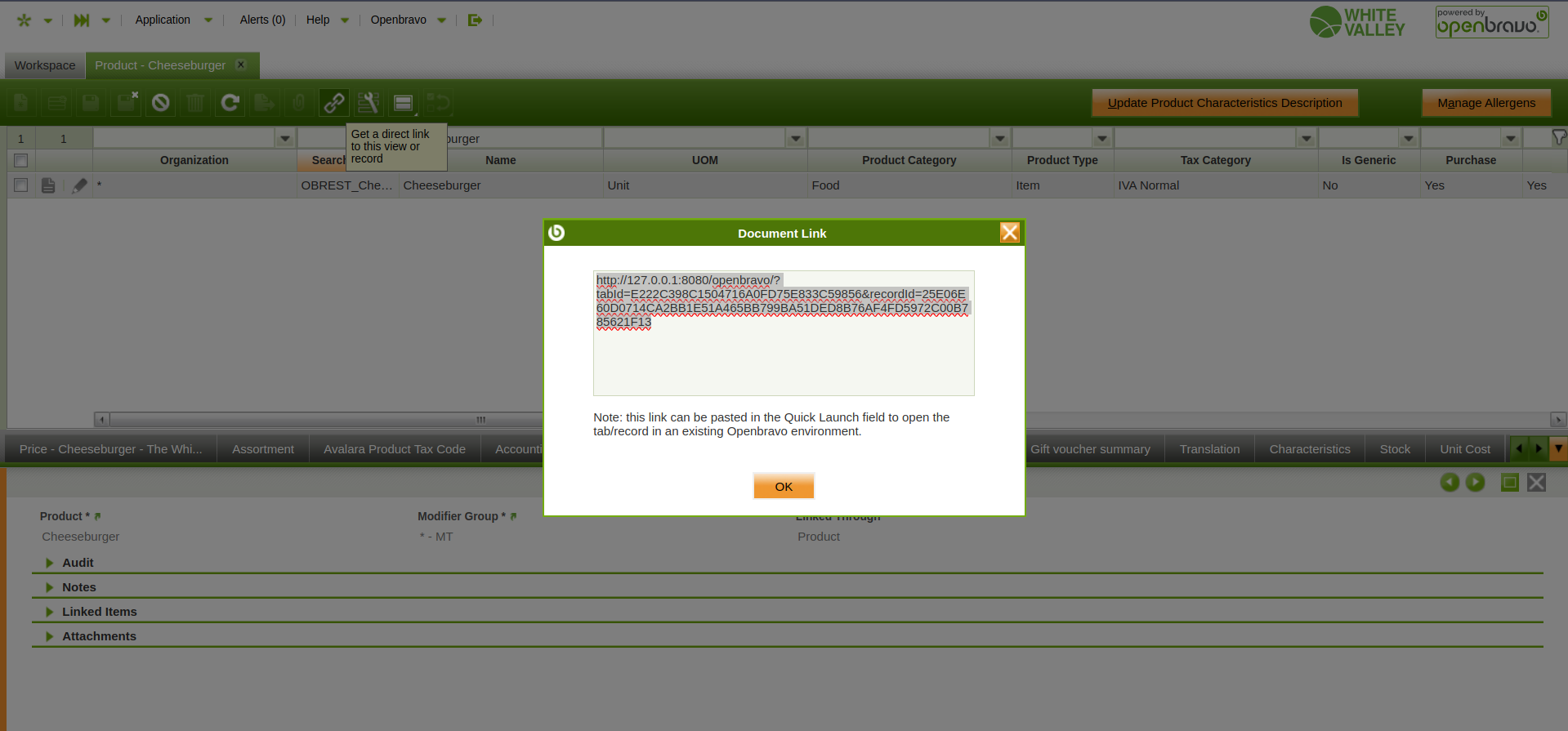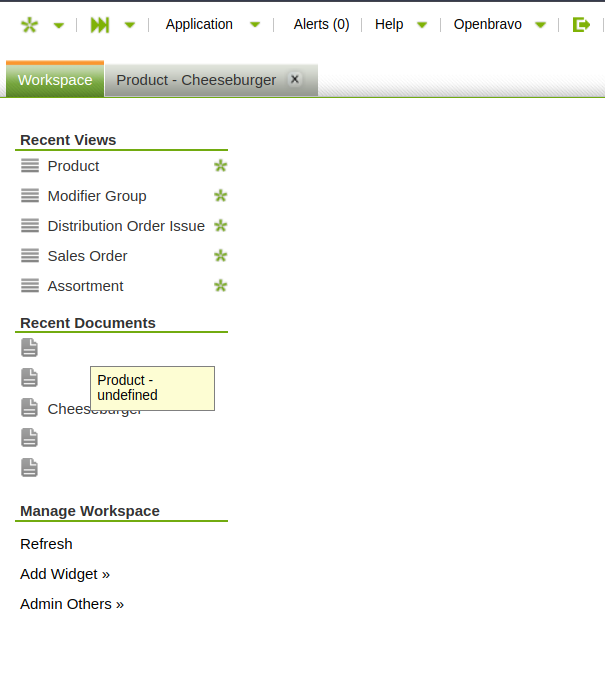 | Steps To Reproduce | 1. Log into the BO 2. Using the "White Valley Group Admin" role, navigate to the Product window 3. Search for the product "Cheeseburger" by name 4. Select the product and open the "Assigned Modifier Groups" tab 5. Open one of the records in grid view and then select the "Document Link" button (represented by the chain symbol in the toolbar) 6. Copy and paste the link provided in the Quick Launch field or directly in the navigation field of the browser and enter. At this point no record is found (error) 7. Navigate to the Workspace window and observe the most recent (topmost) record in the list titled "Recent Documents". Hover over the blank space and observe the help message "Product - undefined" (error) 8. Click on the space and observe the blank window (error) | |||||||||||
