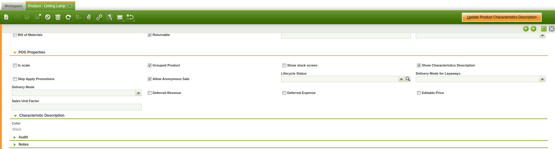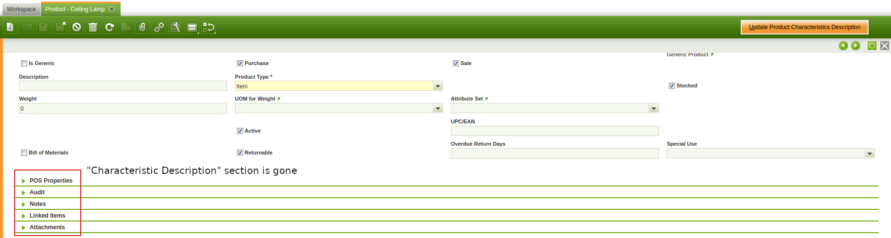 | Description | Having an section in the [Product] window which is placed above the "Characteristic Description" section, makes the "Characteristic Description" wrongly disappear when the upper section is collapsed. | |||||||||||