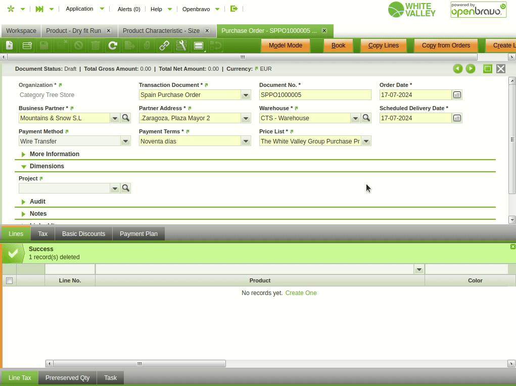 | Steps To Reproduce | It can be tested on a pos2-modules environment: https://livebuilds.openbravo.com/context/retail_pos2_modules_pgsql/ [^] 1. Login in backoffice as White Valley Admin 2. Go to Product Characteristics window 2.1. Select record Color, and in "Relevant Characteristic" select Color and save. 2.2. Select record Size, and in "Relevant Characteristic" select Size and save. 3. Go to Product window and search for product named "Dry Fit Run" 3.1. Select the generic product, then go to "Characteristics Dimensions" field group. 3.2. Check Enable Characteristic Dimensions and in Row Characteristic select Color, Column Characteristic select Size. 4. Go to Purchase Order window and create a new one 4.1. Set any value on the business partner. 5. Click on "Model Mode" on the top right. 5.1. Click on "Add New" and add the Dry Fit Run product 5.2. On the bottom grid in the Model Mode process, put on some combination of color/size a positive value, for example 5 5.3. Click on Done 6. Check that in Lines subtab of the order, there is a new line with Operative Qty and Ordered Qty properly set to the inputted value. 7. Open Model Mode again and now change that value to another positive value, for example 2. Then click on Done. 8. Check that in Lines subtab of the order, the order line has a mismatch between Operative Qty and Ordered Qty, only the Ordered Qty has been updated, which is incorrect. | |||||||