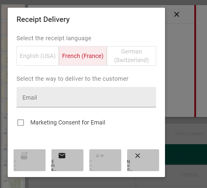 | Steps To Reproduce | 1. Login POS 2. Add a product and go to pay it. 3. When paying, if the receipt delivery popup is correctly configured, the receipt delivery will be displayed with the wrong format of the buttons. | |||||||