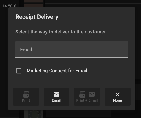 | Description | The Receipt Delivery Popup has the visualization of the Print Option in a wrong format, not letting know which are the options. The buttons: Print, Email, Print and Email and None are NOT correctly displayed, avoiding to read which are the Receipt delivery options easily. | |||||||