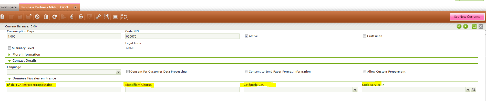 | Steps To Reproduce | For a BusinessPartner define the following data: Intracommunity VAT number Chorus identifier CEC category Service code | |||||||||||