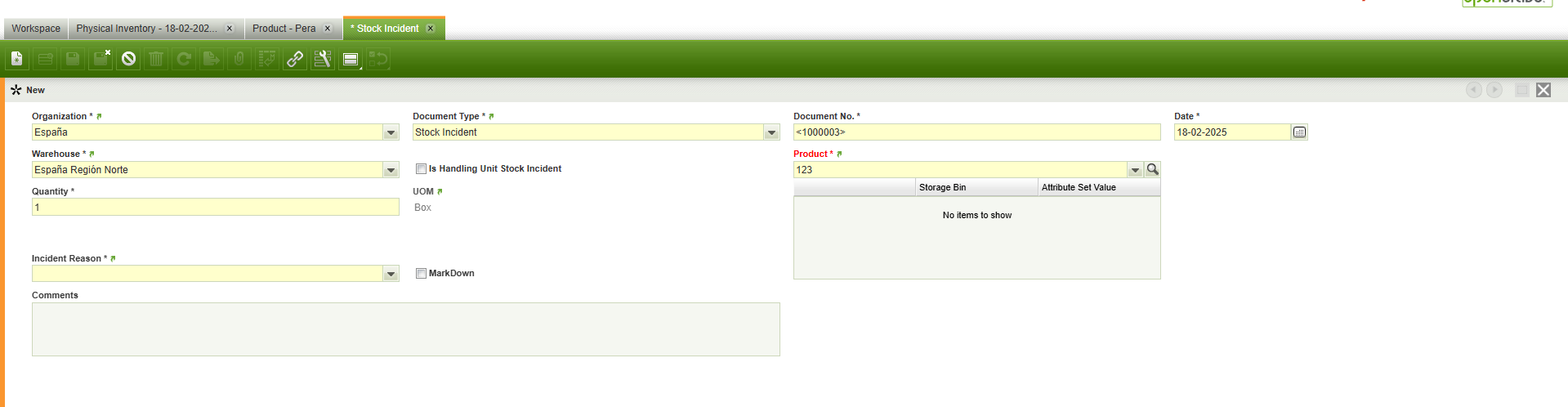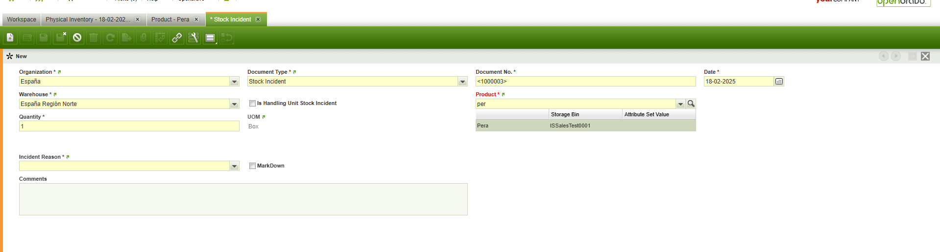 On BackOffice go to physical inventory window and create an inventory for store 'España', Warehouse 'España Región Norte', product 'Pera', and bin 'ISSalesTest0001'