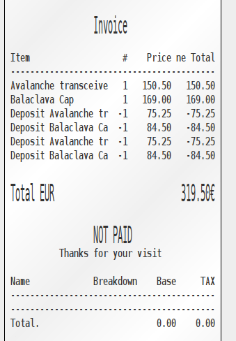 DescriptionWhen issuing a completely paid order that has had deposit invoices associated, the taxes and totals are wrong in the printed ticket. This also causes an exception in backoffice, generating an EWI.