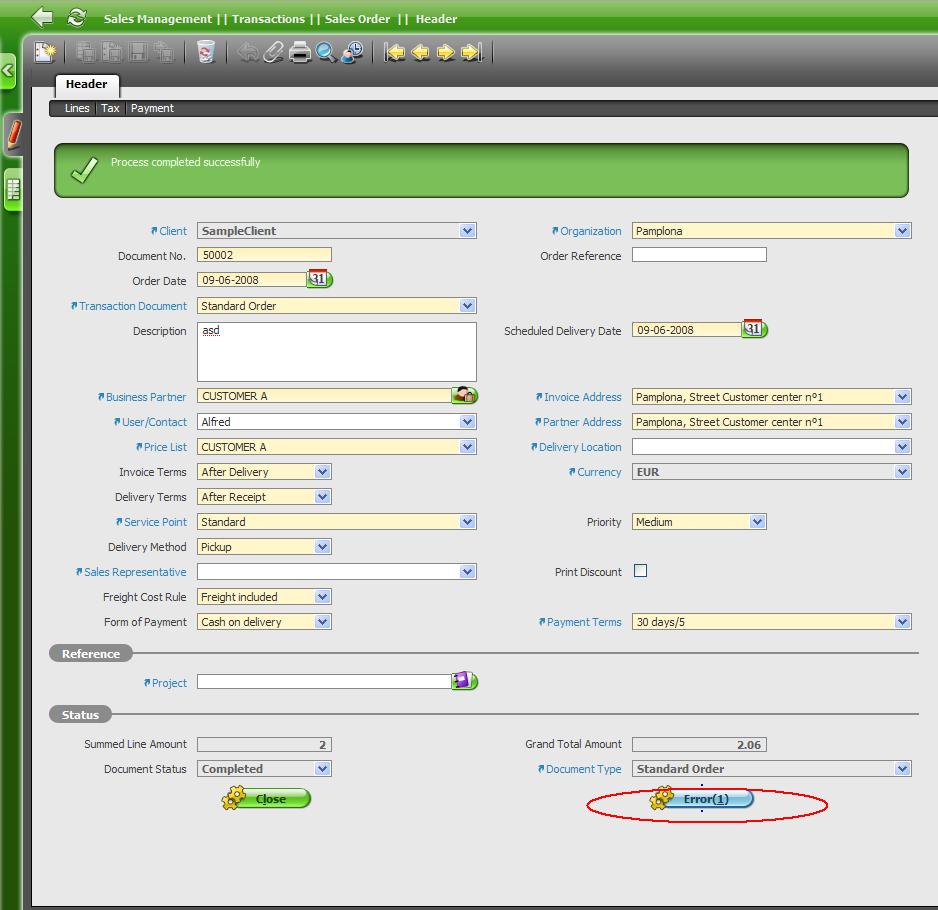 | Description | Try to create a posting of a completed document and get an error (i.e. clicking on Posted button of a completed Sales Order). The button changes to "Error(1)" (see attach) This is very confusing, because you will trend to think that one error was found. And then, you will click the button expecting a pop up with that error. But the popped window is for deleting accounting entry. | ||||||||||