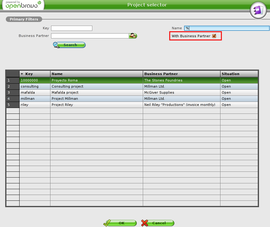 | Proposed Solution | 1) Put a 'With Business Partner' check box in the project selector. 2) Reports of 'Project and Service Management' need also to be reviewed in order to display data of projects that do not have a business partner. | ||||||||||