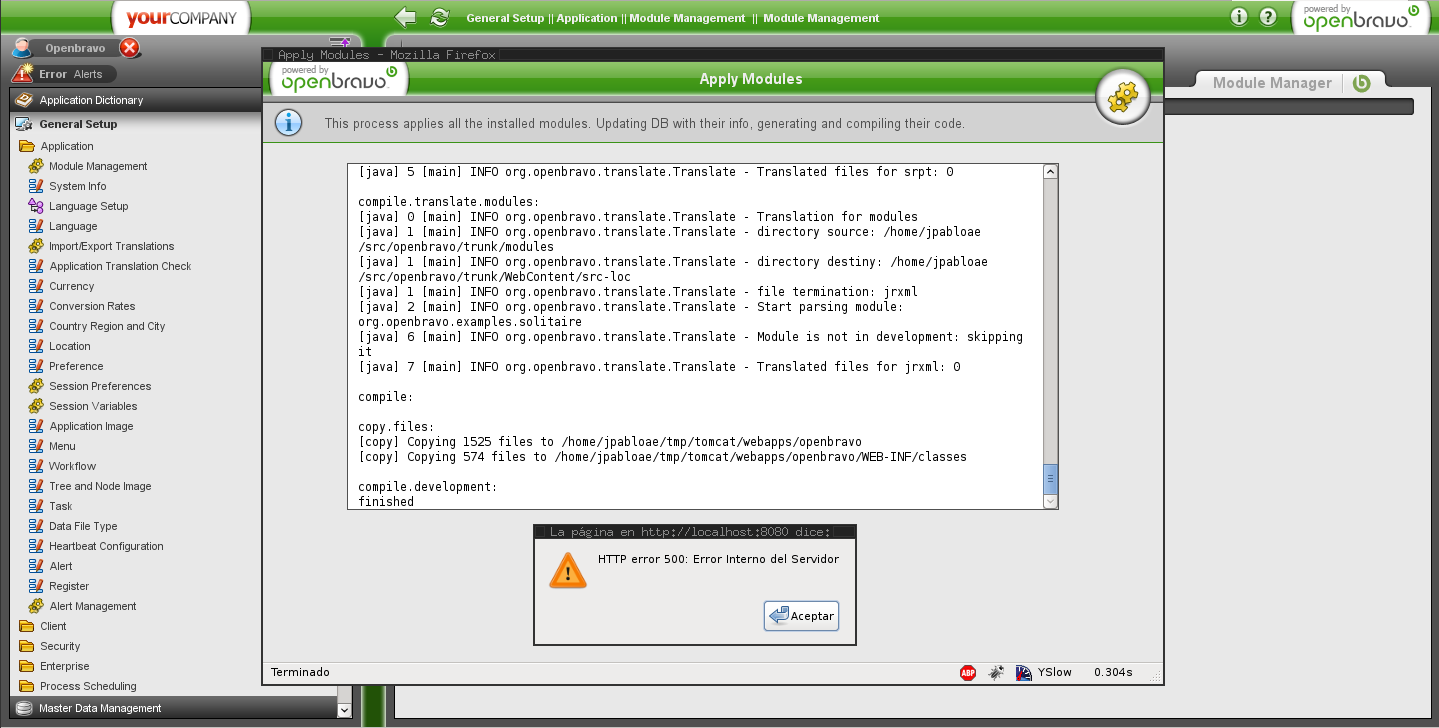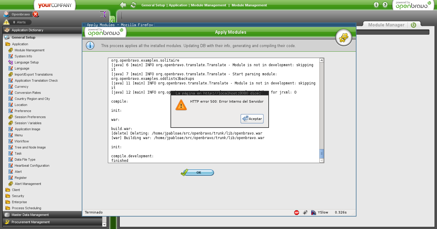 | Description | I get a 500 error building a module after installing it. Screenshot attached (500error_module.png). This error generated an error in the tomcat catalina.out file. Attached (error500_catalina-out.log). The "ant diagnostic" is successful (ant-diagnostic.log). | |||||||
