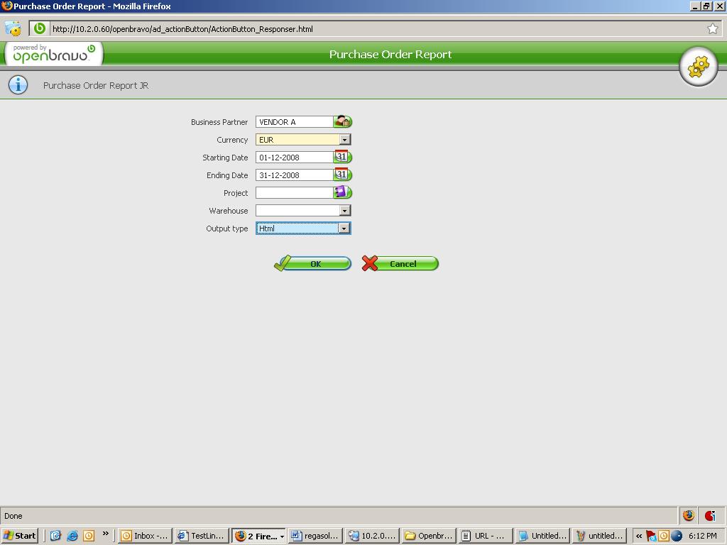 | Steps To Reproduce | * Login as Openbravo with Openbravo Admin role * Go to Procurement Management->Analysis Tools-> Purchase Order Report * A pop-up window must show up * Click the Business Partner icon and verify: * When you click the business partner icon, a pop-up window must show up and the radio button 'All' must be checked. Please select a vendor and click 'OK' * The Currency 'EUR' is selected by default * Fill the dates: Starting Date: 01-12-2008 Ending Date: 31-12-2008 * Select the 'Output type' as Excel, Html and PDF and verify the reports SEE ATTACH | |||||||