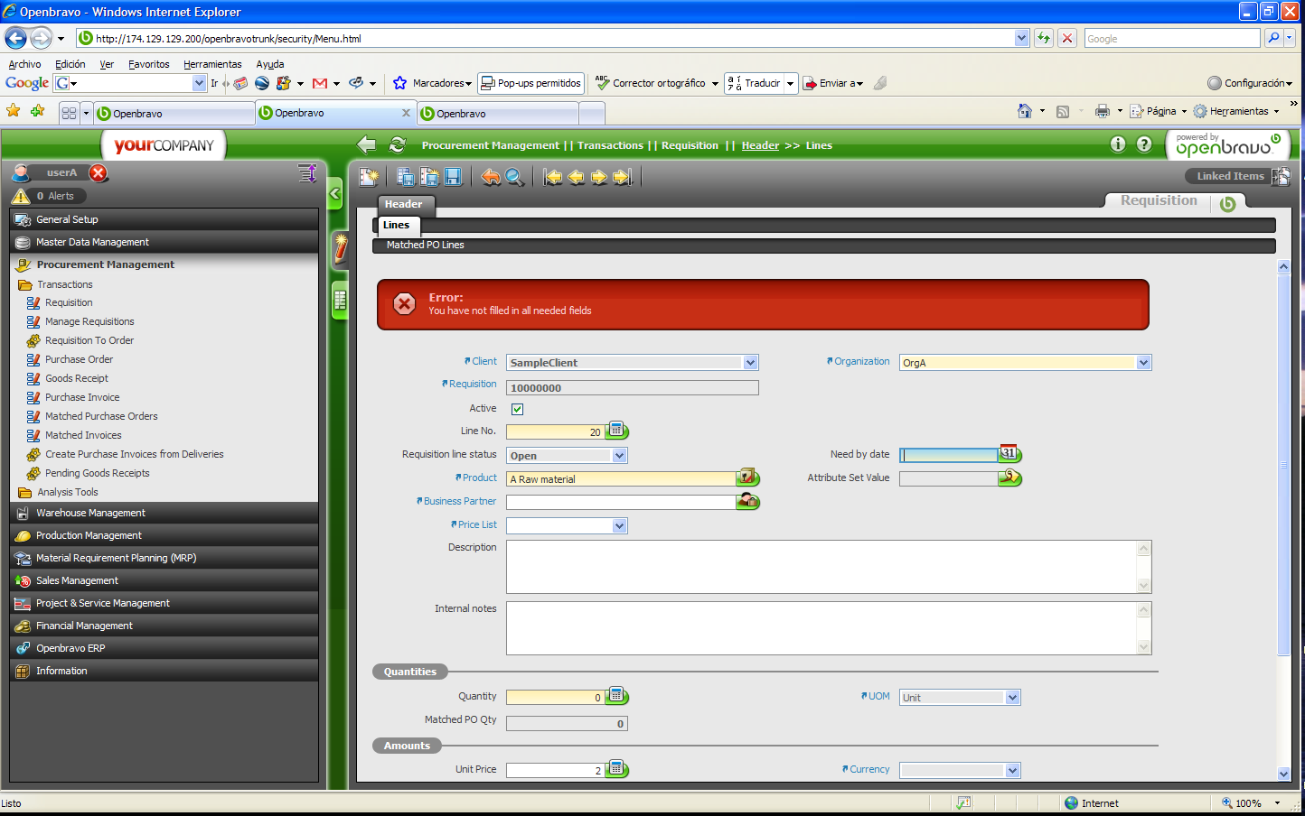 2. Go to Procurement->Transactions->Requisition. click new and save