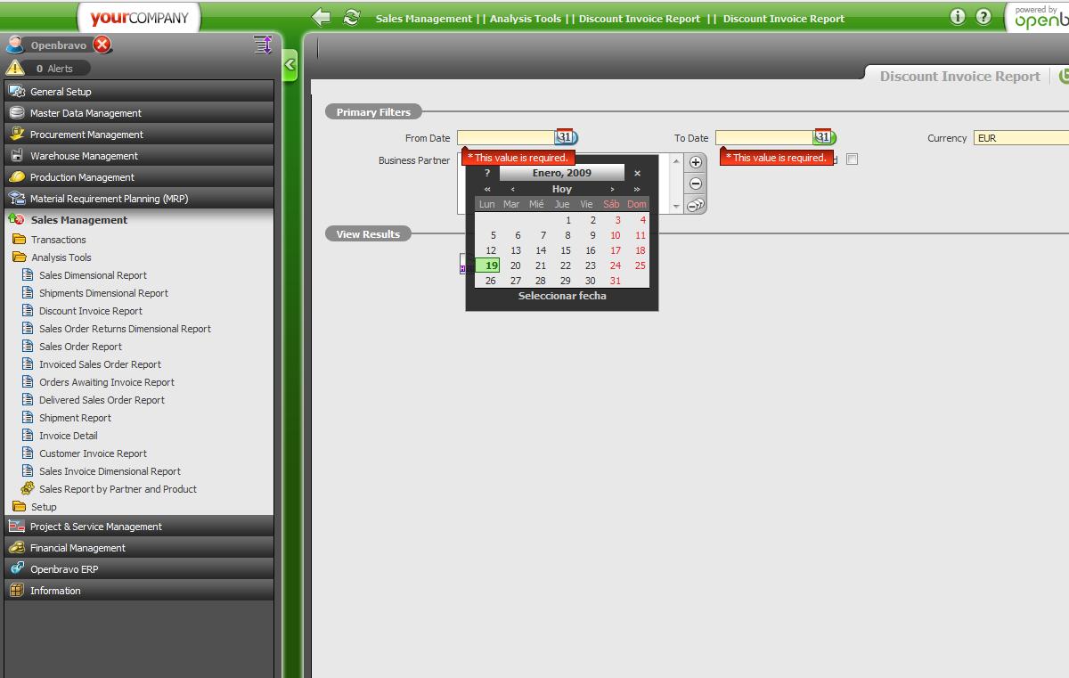 | Summary | 0006998: Calendar in "Discount Invoice Report " shown in Spanish. | |||||||