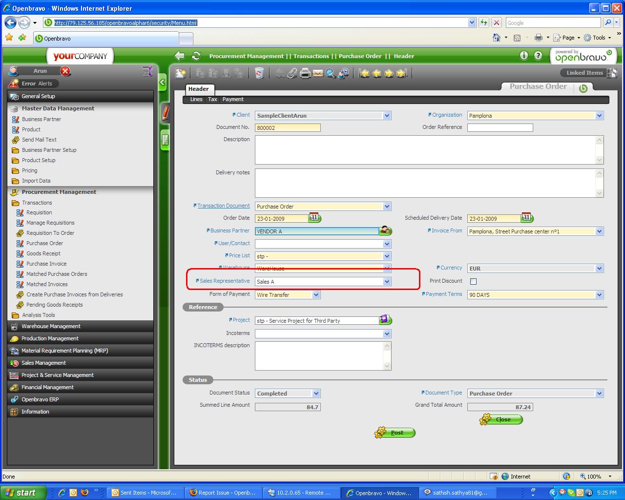 | Steps To Reproduce | # Login as userA # Go to Procurement management->Transactions->Purchase Order # verify there is a field called "Sales Representative" in Header tab | |||||||