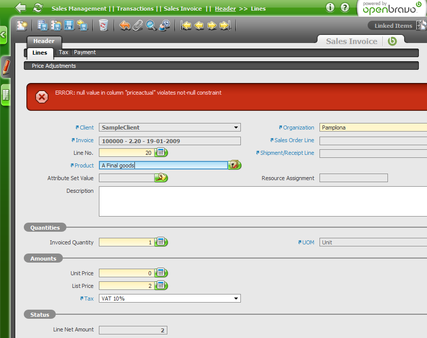 | Steps To Reproduce | 1. Create a Sales Invoice 2. Create a line for the invoice 3. Enter a product 4. Save. Verify that Line Net Amount has the correct value. 5. Modify the price changing Unit Price to "asd" 6. Save. A wrong error message is shown. See attach. Note that Line Net Amount keeps the previous value | |||||||