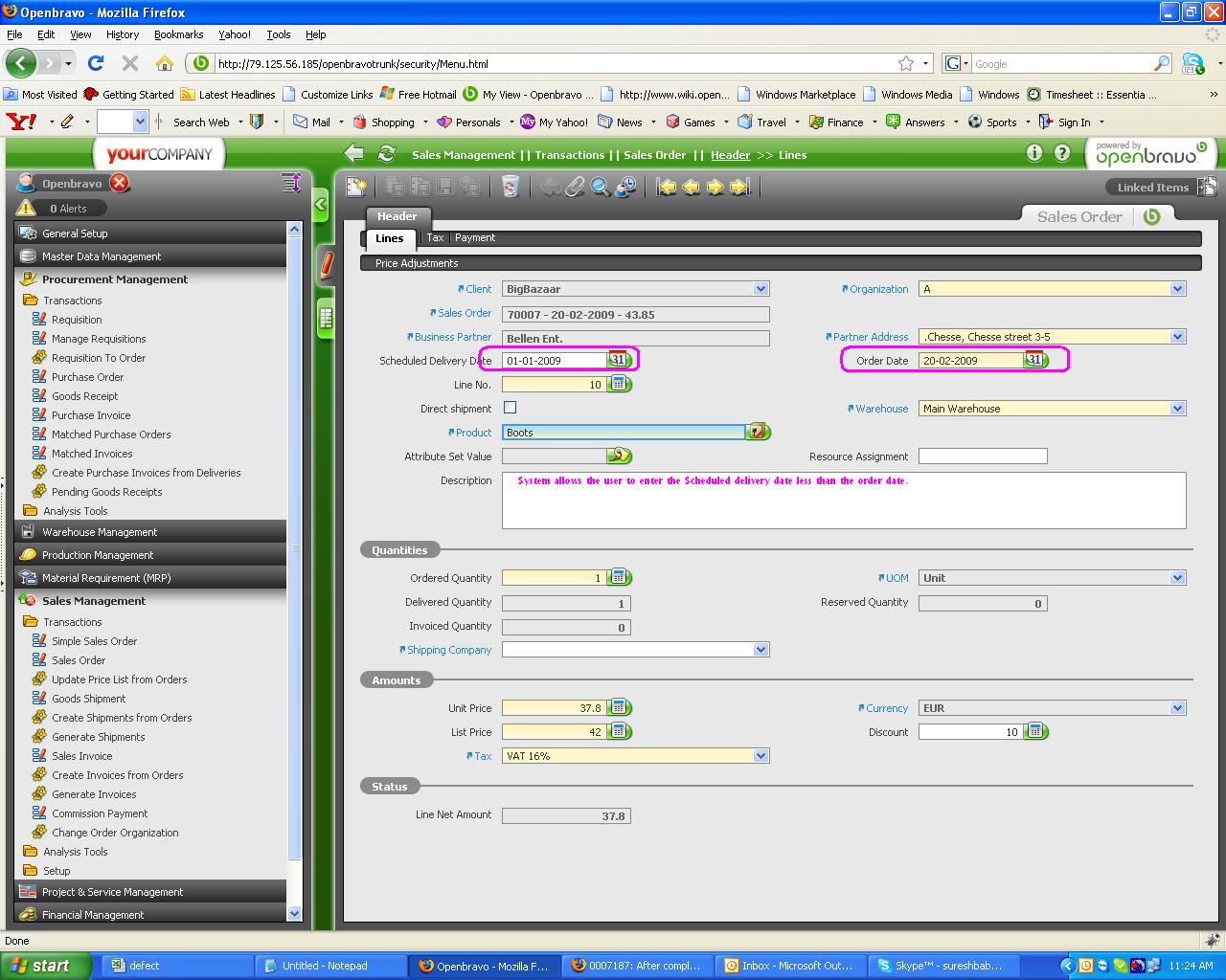 | Steps To Reproduce | Steps to reproduce: Step 1: Create a sales order by selecting a business partner. Sales Management || Transactions || Sales Order || Header Step 2: Move to line items tab and select a product and enter the required details and change the Delivery date less than one month from Order date (i.e delivery date : 01/01/2009 and Order date: 01/02/2009) Step 3: move back to header tab and click complete button, Process completed successfully message appears. | ||||||||||