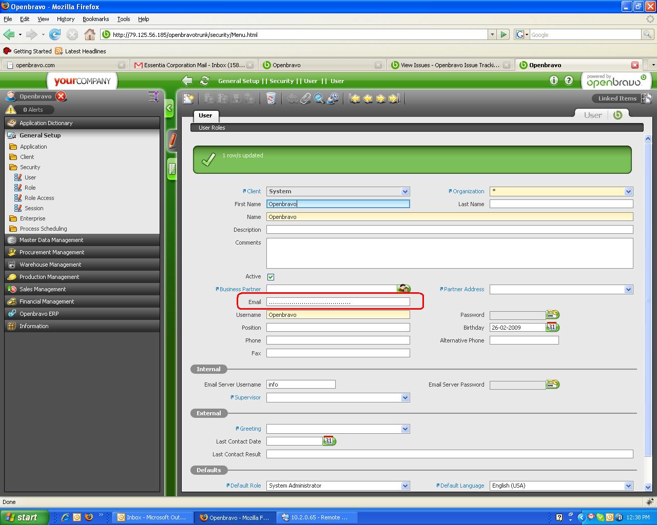 | Description | Login as Openbravo/openbravo Go to General Setup -> Security -> User. Enter full of dots (....................) in the Email field. Save the record. Application accepts the invalid email address. | |||||||