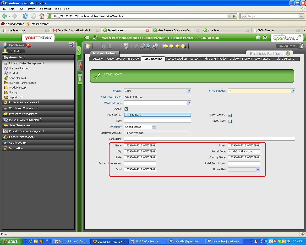 | Steps To Reproduce | Go to Master Data Management -> Business Partner Select a business partner & go to "Bank Account" tab. Verify the data validation by giving the following input data to the text fields. Name : 123456789012345678901234567890 City : 123456789012345678901234567890 State : 123456789012345678901234567890 Email : 123456789012345678901234567890 Street : 123456789012345678901234567890 Postal code : abcdefghijklmnopqrst Country Name: 123456789012345678901234567890 | |||||||