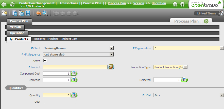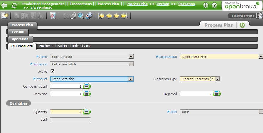 | Steps To Reproduce | Add one activity (Production Management || Setup || Activity). Go to the processplan (production management || transactions || process plan) and create a new record, entering random data in the header and in the version tab. In the Operation tab you enter random data and the activity that you created above. Then you go to the I/O Products tab and enter a new record. Notice that the part field is not a pull down screen, but a selectable field. When you look for a semi-finished product, for example 'Stone Semi-slab', it can not be found in the selector, whereas in the pulldown field the product Stone Semi-slab was in the pulldown values. | |||||||