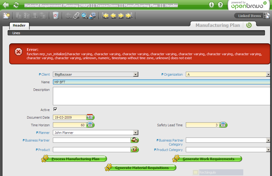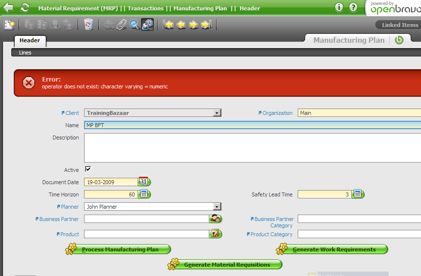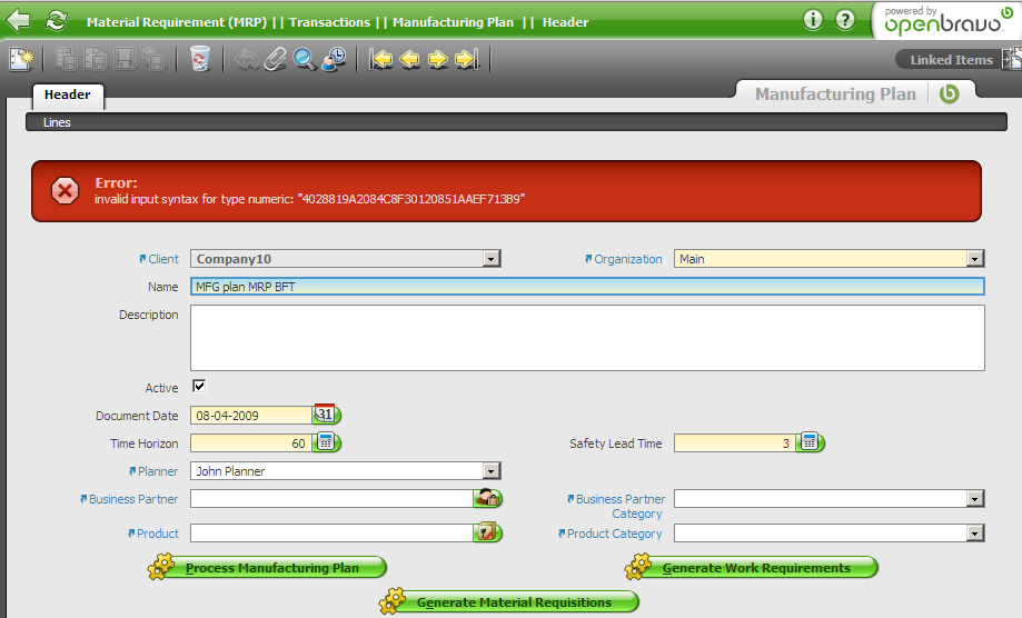 | Description | Material Requirement Planning (MRP) || Transactions || Manufacturing Plan || Header I ran the mfg plan in both the 250 vm (snapshot 1) and in our 250 r11 Training (snapshot 2) and in both cases I had an error (different ones). | |||||||