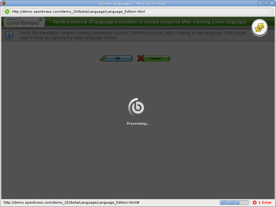 The process finishes sucesfully, but the window continues in precessing status. The workaround is to monitor the system (with top for example) and when postgres or oracle goes idle, wait a minute, and close the "verified language" window. After closing the "verified language" window, you end in "language" window, press the grid mode, and should appear the sucessfull green message that should be appeared in the "verified language" window. |