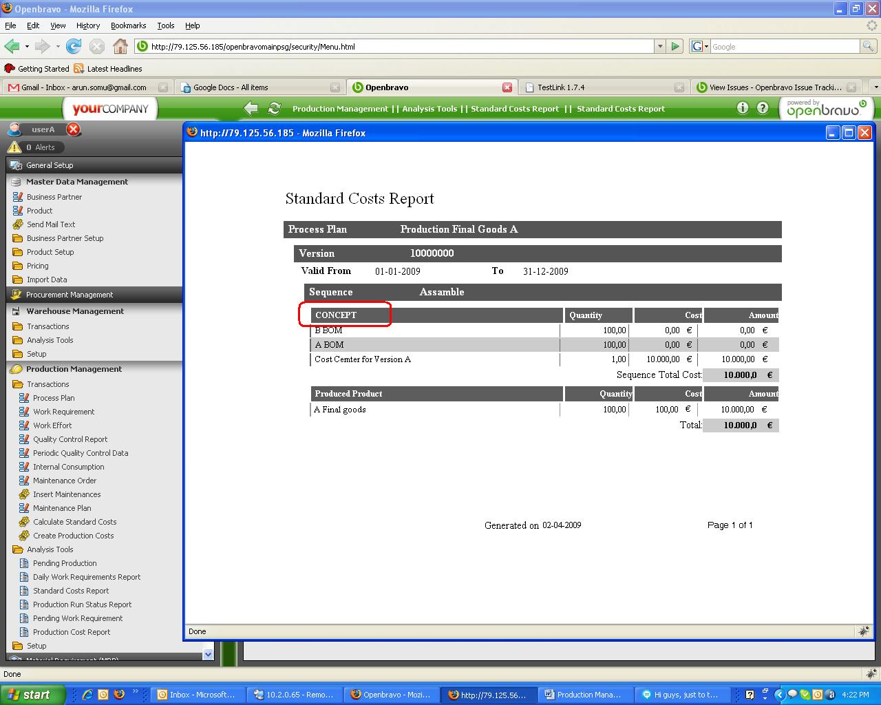 | Steps To Reproduce | # Login as userA # Go to Production management. # Run the steps for processing a work requirement. # Click ok for "Calculate Standard Costs" in Production Management -> Transactions. # Go to Production Management -> Analysis Tools -> Standard Costs Report. # Report is displayed. But the label Concept is not correct. | |||||||