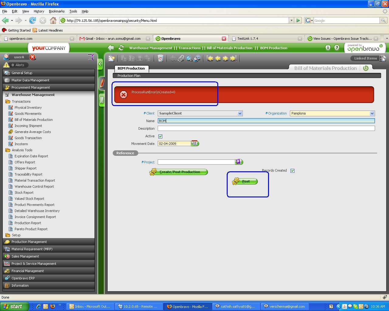 | Steps To Reproduce | * Login as userA * Go to Warehouse management->Transactions->Bill of materials production * Click New. Fill Name = BOM A. Save * Move to Production Plan and click NEW * Select Product "A BOM" and production quantity 100. * Select a storage bin. Save * Move back to BOM Production tab * Click on Button "Create/Post Production" * Go to I/O products and verify: o One line for product A BOM. Quantity = 100 o One line for product B Raw material. Quantity = -100 o One line for product C Raw material. Quantity = -100 * Select A BOM product * Click on Attribute Set Value icon and fill the attributes. Save * Move back to BOM Production Tab * Click on Button "Create/Post Production" * Click on Button "Post". Process run error message is displayed. | |||||||