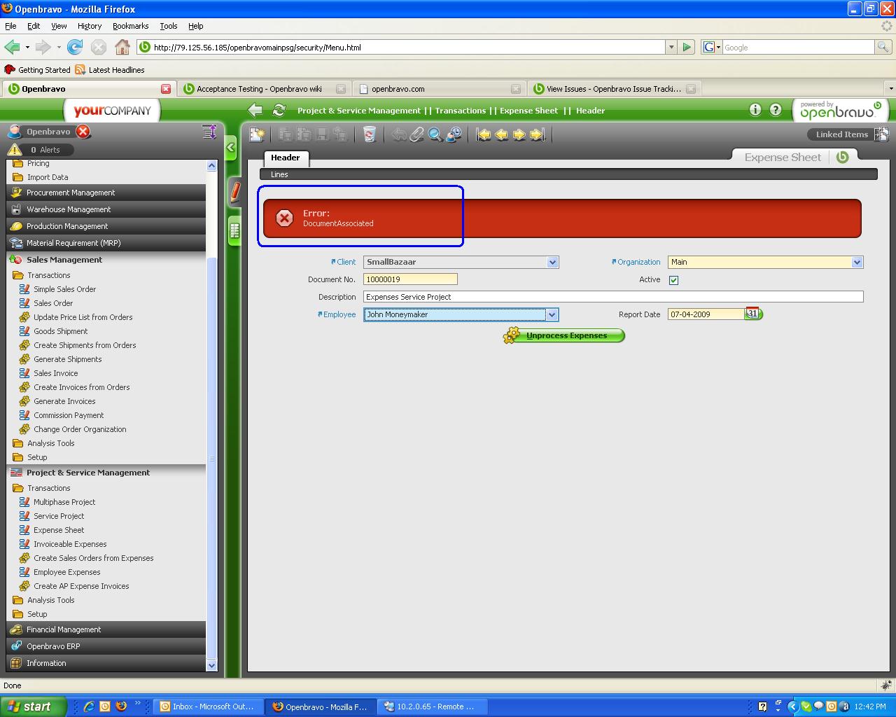 | Steps To Reproduce | Login as Openbravo & Change the role to Openbravo Admin Go to Project & Service Management->Transactions->Expense Sheet Click New and fill: Description: Expenses Consultancy Employee: John Moneymaker Go to Lines tab. Click New and fill: Reinvoincing: Y Product: Service A11 Quantity: 1 Project: sca – Service Project for Customer A Check that: UOM: Day Business Partner: McGiver Supplies Go back to Header tab. Click on Process Expenses button. Go to Project & Service Management->Transactions->Create Sales Orders from Expenses Edit: Customer: McGiver Supplies Date Ordered 07-04-2009 Tick Complete and Process Sales Orders automatically check box (checked). Click on Process button. Now Sales order has been created for the expenses. Now again try to clcik "Process Expenses" button in Expense Sheet. It throws an error message as "DocumentAssociated". It is not visible for the end users. | |||||||