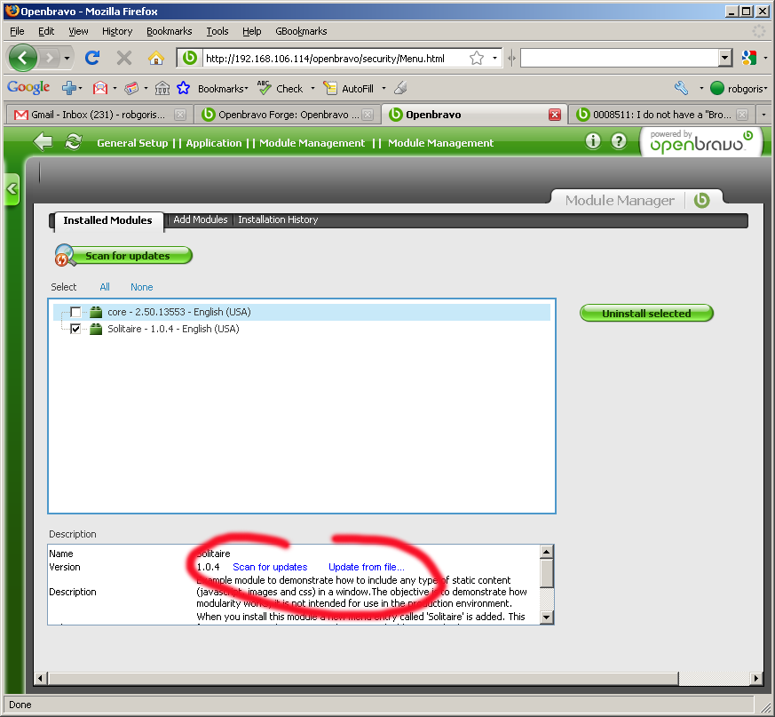 DescriptionI am testing the update from 2.50beta to 2.50 by loading an .obx file. I noted that I have not a button to browse the file system on the "Installed Modules" tab. In order to update an installed module I have to upload a file from the "Add Module" tab. That has no sense.