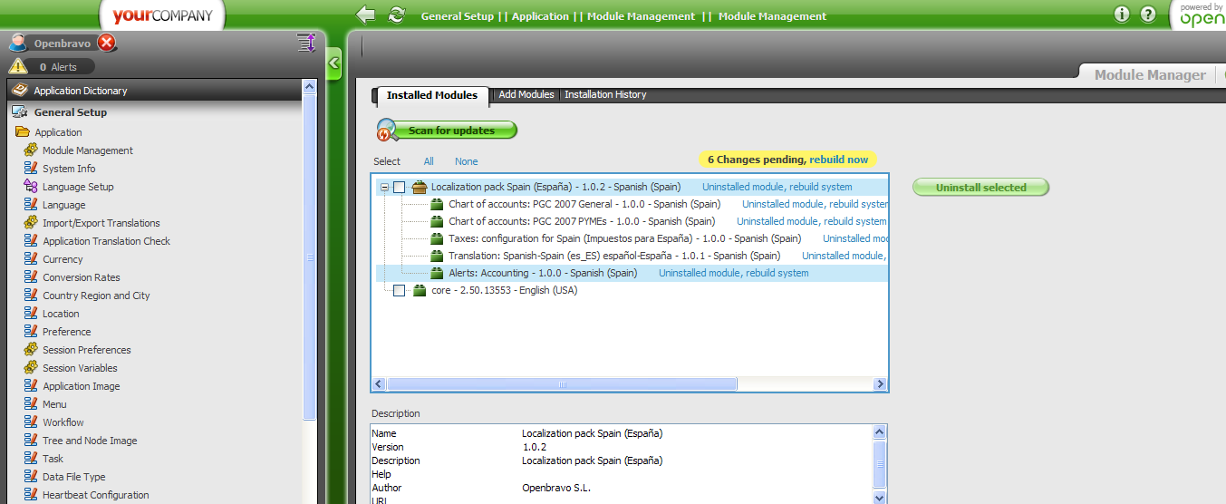 | Description | 1.I tried to install Spanish localization pack downloading from central repository. 2. I select the Spanish localization pack and when I confirm that I understand the agreement and after a few seconds an error message shows up saying that Webservices does not work and the perform will rollback 3. But in the Module management window I can see the Spanish localization pack. See Attach_1.png 4. When I click to rebuild, it fails because in fact I have nothing in the reference data folder. See the log: apply.modules: [echo] Applying org.openbravo.alerts.accounting, org.openbravo.localization.spain, org.openbravo.localization.spain.referencedata.accounts, org.openbravo.localization.spain.referencedata.accounts.pymes, org.openbravo.localization.spain.referencedata.taxes, org.openbravo.localization.spain.referencedata.translation.esES modules... init: set.code.rev: code.rev: update.database.mod: init: database.lib: init: compile: build.jar: jar: init: core.lib: init: compile: build.jar: build: copy.core.lib: update.database.mod: Database connection: jdbc:postgresql://localhost:5433/main250. [^] User: tad_250 Database was modified locally, but as update.database command is forced, the database will be updated anyway. Creating submodel for application dictionary The following error occurred while executing this line: C:\OpenbravoERP-Main-psg\main\build.xml:535: The following error occurred while executing this line: C:\OpenbravoERP-Main-psg\main\src-db\database\build.xml:132: java.lang.NullPointerException C:\OpenbravoERP-Main-psg\main\build.xml:614: The following error occurred while executing this line: C:\OpenbravoERP-Main-psg\main\build.xml:535: The following error occurred while executing this line: C:\OpenbravoERP-Main-psg\main\src-db\database\build.xml:132: java.lang.NullPointerException C:\OpenbravoERP-Main-psg\main\build.xml:614: The following error occurred while executing this line: C:\OpenbravoERP-Main-psg\main\build.xml:535: The following error occurred while executing this line: C:\OpenbravoERP-Main-psg\main\src-db\database\build.xml:132: java.lang.NullPointerException at org.apache.tools.ant.ProjectHelper.addLocationToBuildException(ProjectHelper.java:508) at org.apache.tools.ant.taskdefs.Ant.execute(Ant.java:418) at org.apache.tools.ant.taskdefs.CallTarget.execute(CallTarget.java:105) at org.apache.tools.ant.UnknownElement.execute(UnknownElement.java:288) at sun.reflect.GeneratedMethodAccessor168.invoke(Unknown Source) at sun.reflect.DelegatingMethodAccessorImpl.invoke(Unknown Source) at java.lang.reflect.Method.invoke(Unknown Source) at org.apache.tools.ant.dispatch.DispatchUtils.execute(DispatchUtils.java:106) at org.apache.tools.ant.Task.perform(Task.java:348) at org.apache.tools.ant.Target.execute(Target.java:357) at org.apache.tools.ant.Target.performTasks(Target.java:385) at org.apache.tools.ant.Project.executeSortedTargets(Project.java:1337) at org.apache.tools.ant.Project.executeTarget(Project.java:1306) at org.apache.tools.ant.helper.DefaultExecutor.executeTargets(DefaultExecutor.java:41) at org.apache.tools.ant.Project.executeTargets(Project.java:1189) at org.openbravo.erpCommon.utility.AntExecutor.runTask(AntExecutor.java:222) at org.openbravo.erpCommon.ad_process.ApplyModules.startApply(ApplyModules.java:221) at org.openbravo.erpCommon.ad_process.ApplyModules.doPost(ApplyModules.java:63) at javax.servlet.http.HttpServlet.service(HttpServlet.java:710) at org.openbravo.base.HttpBaseServlet.serviceInitialized(HttpBaseServlet.java:225) at org.openbravo.base.secureApp.HttpSecureAppServlet.service(HttpSecureAppServlet.java:331) at javax.servlet.http.HttpServlet.service(HttpServlet.java:803) at org.apache.catalina.core.ApplicationFilterChain.internalDoFilter(ApplicationFilterChain.java:269) at org.apache.catalina.core.ApplicationFilterChain.doFilter(ApplicationFilterChain.java:188) at org.openbravo.utils.SessionExpirationFilter.doFilter(SessionExpirationFilter.java:66) at org.apache.catalina.core.ApplicationFilterChain.internalDoFilter(ApplicationFilterChain.java:215) at org.apache.catalina.core.ApplicationFilterChain.doFilter(ApplicationFilterChain.java:188) at org.openbravo.utils.CharsetFilter.doFilter(CharsetFilter.java:35) at org.apache.catalina.core.ApplicationFilterChain.internalDoFilter(ApplicationFilterChain.java:215) at org.apache.catalina.core.ApplicationFilterChain.doFilter(ApplicationFilterChain.java:188) at org.openbravo.dal.core.DalRequestFilter$1.doAction(DalRequestFilter.java:79) at org.openbravo.dal.core.ThreadHandler.run(ThreadHandler.java:46) at org.openbravo.dal.core.DalRequestFilter.doFilter(DalRequestFilter.java:85) at org.apache.catalina.core.ApplicationFilterChain.internalDoFilter(ApplicationFilterChain.java:215) at org.apache.catalina.core.ApplicationFilterChain.doFilter(ApplicationFilterChain.java:188) at org.apache.catalina.core.StandardWrapperValve.invoke(StandardWrapperValve.java:210) at org.apache.catalina.core.StandardContextValve.invoke(StandardContextValve.java:174) at org.apache.catalina.core.StandardHostValve.invoke(StandardHostValve.java:127) at org.apache.catalina.valves.ErrorReportValve.invoke(ErrorReportValve.java:117) at org.apache.catalina.core.StandardEngineValve.invoke(StandardEngineValve.java:108) at org.apache.catalina.connector.CoyoteAdapter.service(CoyoteAdapter.java:151) at org.apache.coyote.http11.Http11Processor.process(Http11Processor.java:870) at org.apache.coyote.http11.Http11BaseProtocol$Http11ConnectionHandler.processConnection(Http11BaseProtocol.java:665) at org.apache.tomcat.util.net.PoolTcpEndpoint.processSocket(PoolTcpEndpoint.java:528) at org.apache.tomcat.util.net.LeaderFollowerWorkerThread.runIt(LeaderFollowerWorkerThread.java:81) at org.apache.tomcat.util.threads.ThreadPool$ControlRunnable.run(ThreadPool.java:685) at java.lang.Thread.run(Unknown Source) Caused by: C:\OpenbravoERP-Main-psg\main\build.xml:535: The following error occurred while executing this line: C:\OpenbravoERP-Main-psg\main\src-db
