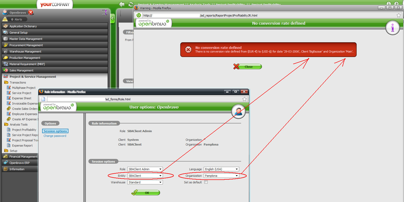 DescriptionI entered some projects and then I launched the report of profitability. All projects currencies were EUR, and the report was requested in USD. I had no conversion rates EUR>USD nor USD>EUR defined for my Client, neither the other clients I had. When launching the report, I had an error message about not defined conversion rates. But note that the error says that BigBazaar client and Main organization have not defined rates (see attach).