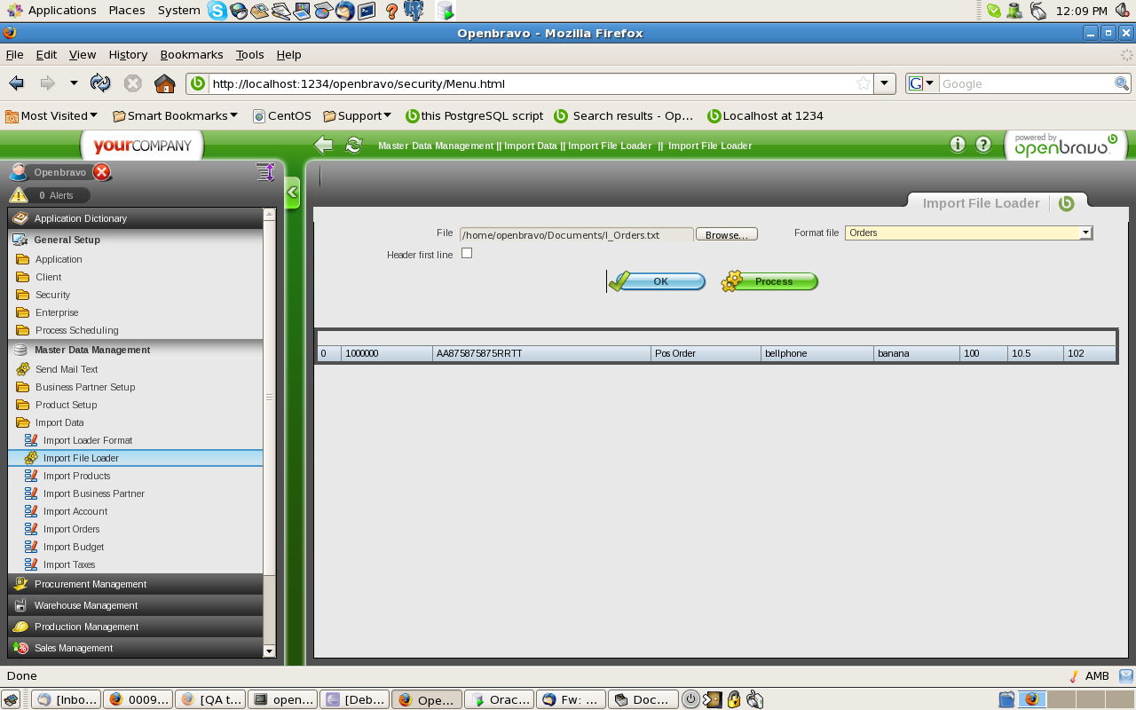 The import file loader works for me and it creates the imported orders correctly (as is shown in your screenshots).