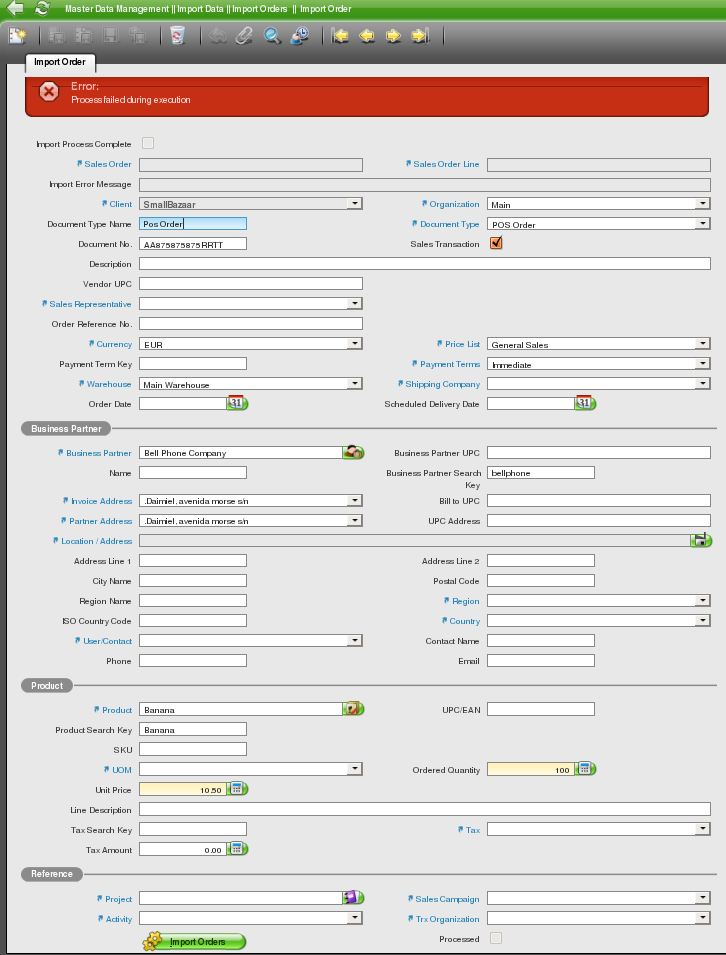 DescriptionIf you add in a imported order a product which doesn't exist in sample data (created by the user) the process of import orders fails.