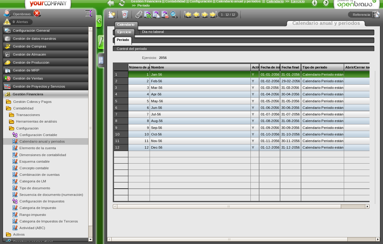 Description1) Gestión Financiera || Contabilidad || Configuración || Calendario anual y periodos || Calendario >> Ejercicio >> Periodo