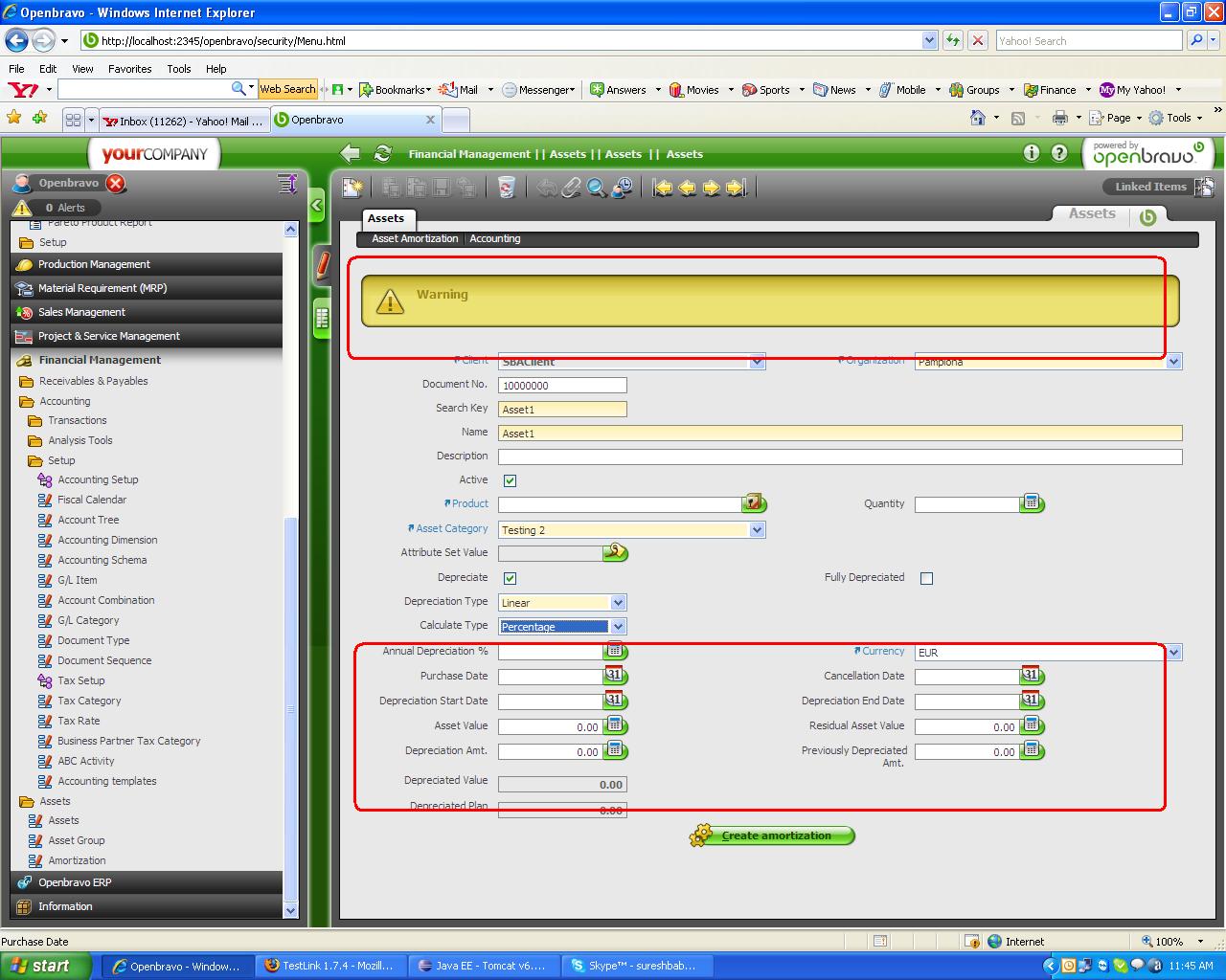 | Steps To Reproduce | 1) Move to Financial Management || Assets || Assets || Assets 2) Enter Search key, Name & select Asset category 3) Click Depreciate check box and click Create Amortization button with out entering any of the fields. Message "Warning " appears without any info. | |||||||