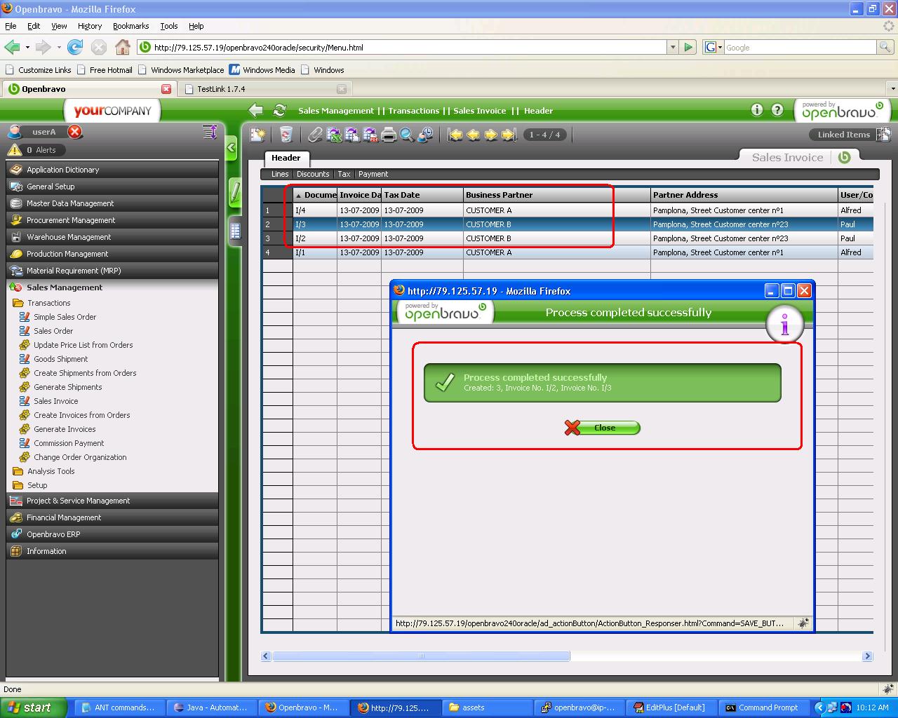 | Steps To Reproduce | * Login as userA * Go to Sales management->Transactions->Sales order * Create six sales order with transaction document "Standard Order" * The dates for the sales order must be at least one month before the current month: o Three sales order for Customer A. For each one create a goods shipment o Three sales order for Customer B. For only two sales order create two goods shipment * Go to Sales management->Transactions->Generate invoices * Select an invoice date and click OK Expected result is * One sales invoice for customer A. This invoice must have the three sales order * Two sales invoice for customer B. One invoice for each sales order | |||||||||||